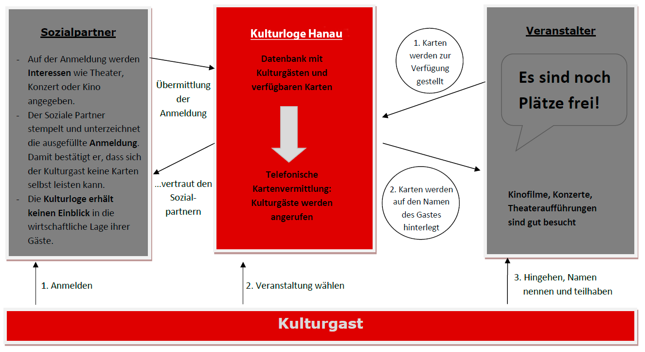 Vorbild für die Vereinsgründung war die KULTURLOGE in Marburg, die es bereits seit 2010 gibt. Inzwischen kommen Kulturgäste in 48 deutschen Städten und Gemeinden in den Genuss, an Veranstaltungen von Kunst über Kultur bis zu Sportevents teilzunehmen.